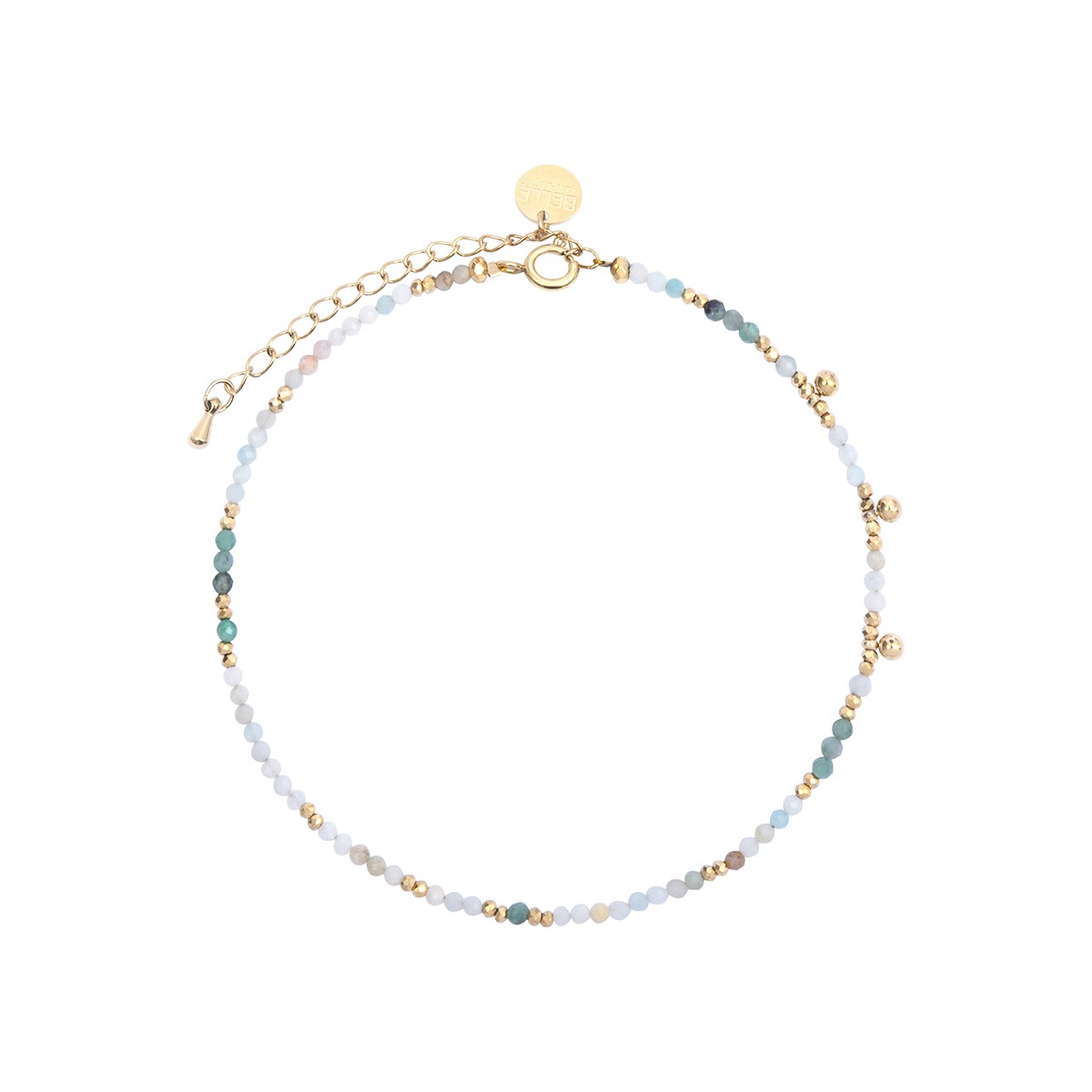 Le bracelet cheville Emi, entièrement confectionné à la main, est composé de pierre de lune blanche, émeraude, hématites dorées et charms en acier inoxydable.