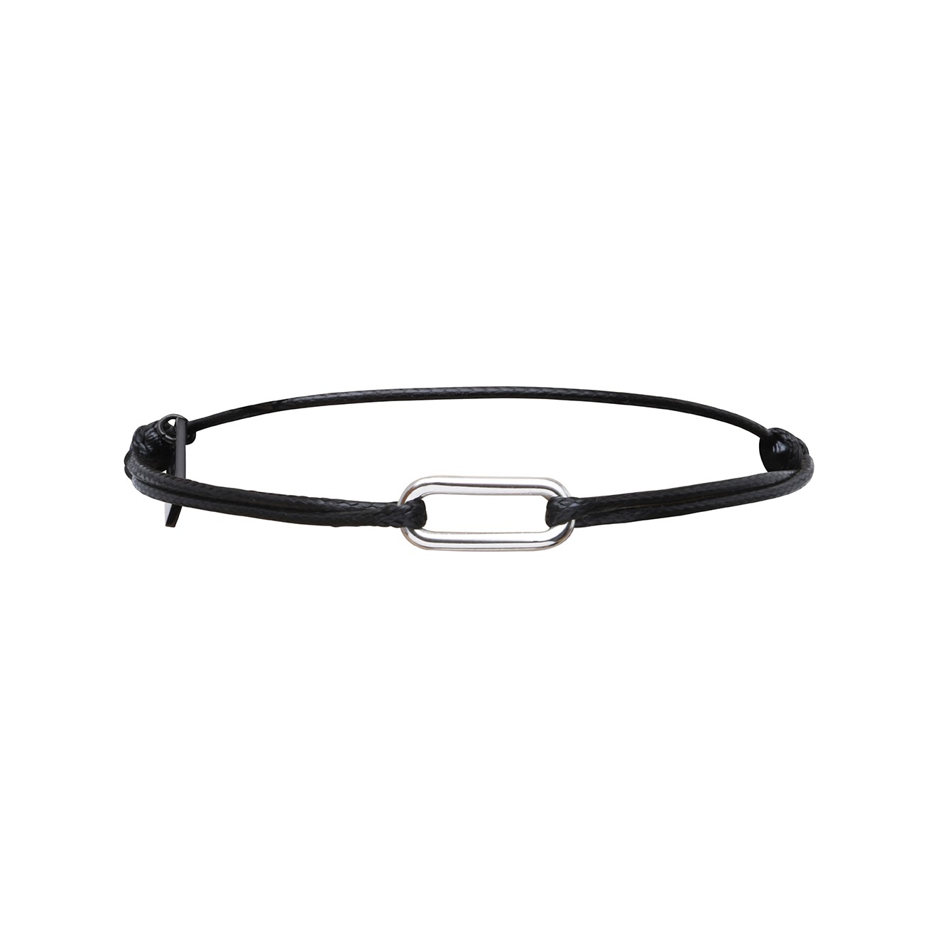 Bracelet Matteo épuré, composé d'un squircle en acier inoxydable, monté sur cordon noir. Fermoir à nœud coulissant ajustable. Longueur ajustable : 16 à 26 cm.
