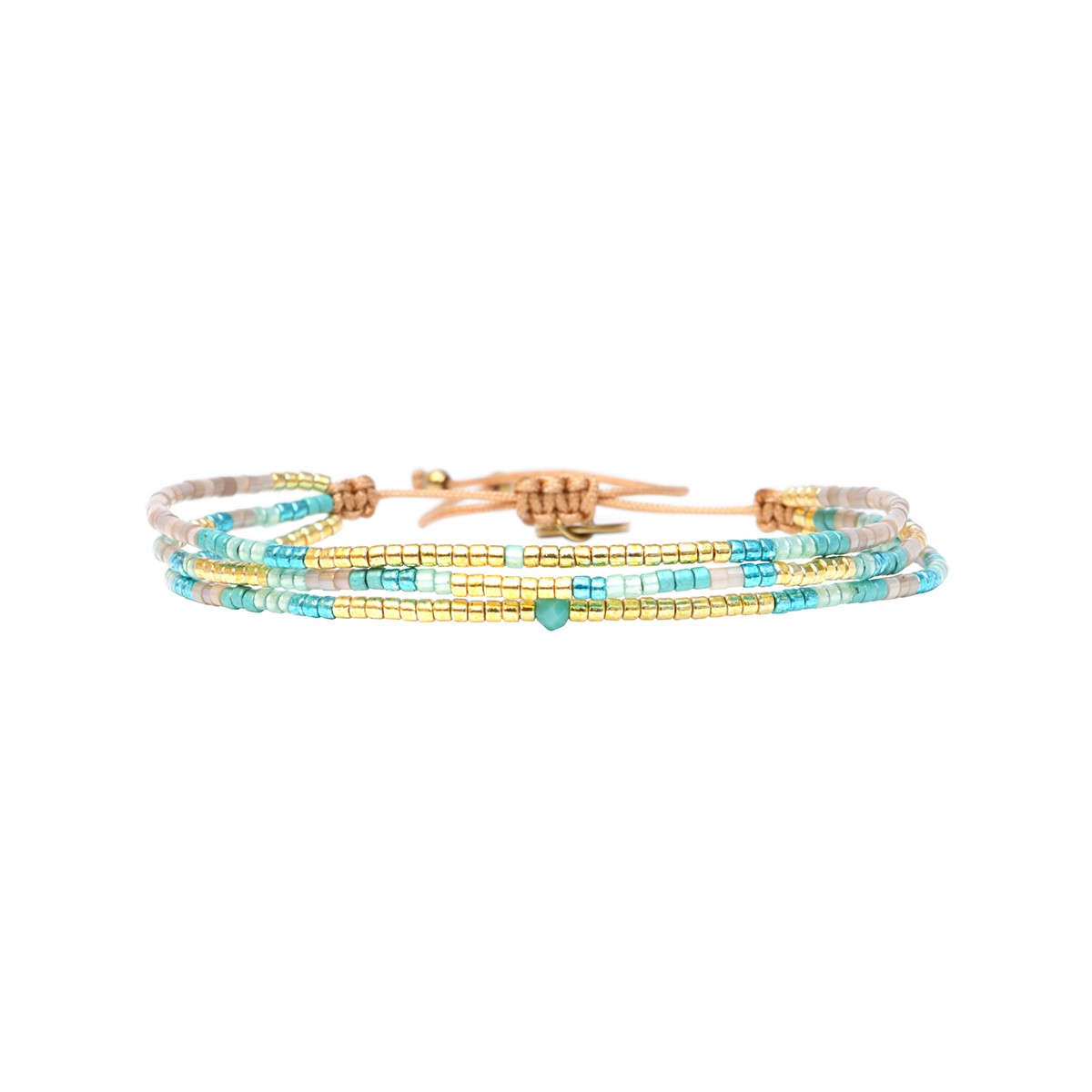 Composition : perles de miyuki dorées - champagne clair sieste au soleil - bleu vert d'eau - bleu des mers du sud - bleu Moorea - cristal turquoise