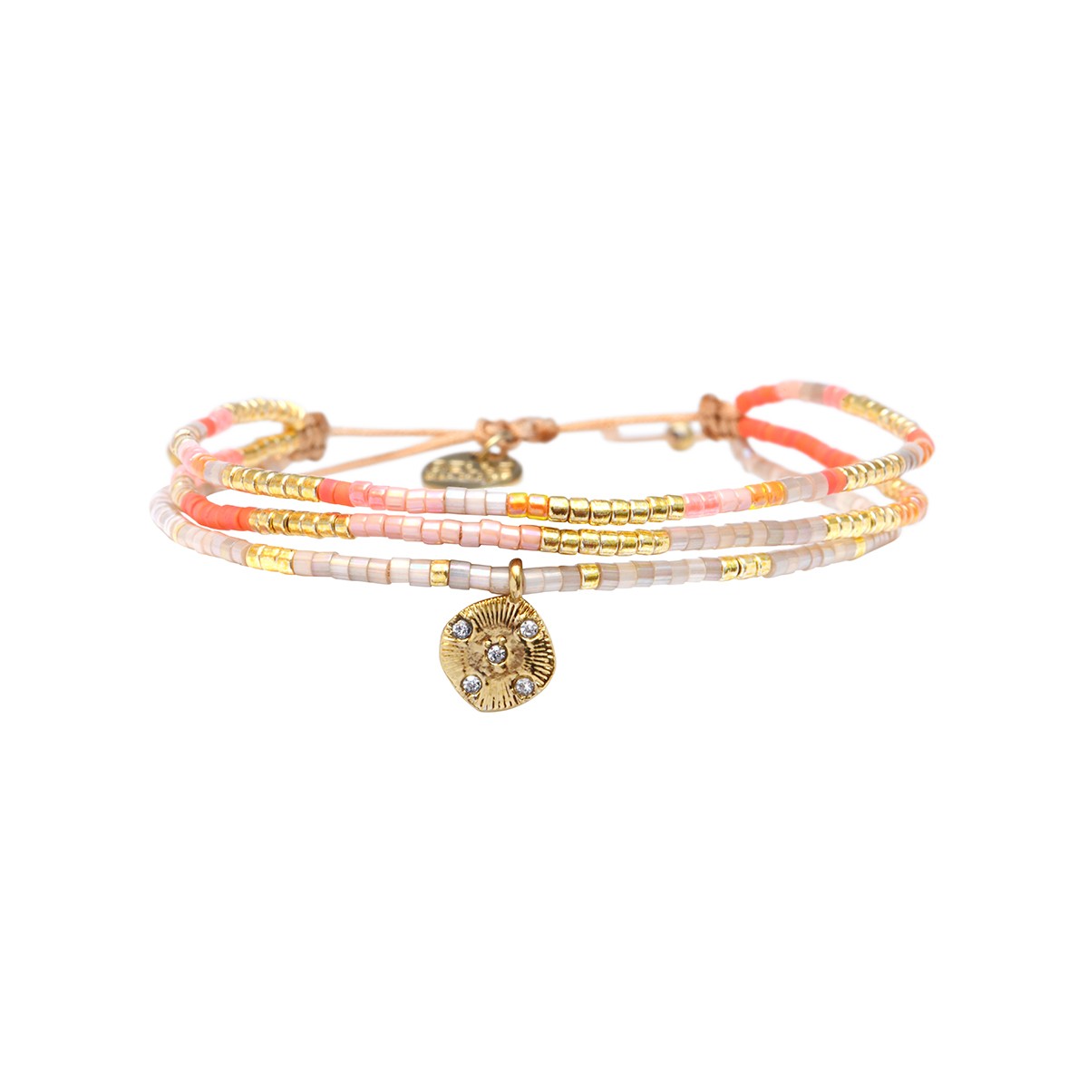 Composition : perles de miyuki dorées - satin de soie ivoire - rose Bora bora - nectarine douce - rose vif incarnat - corail du Yucatan