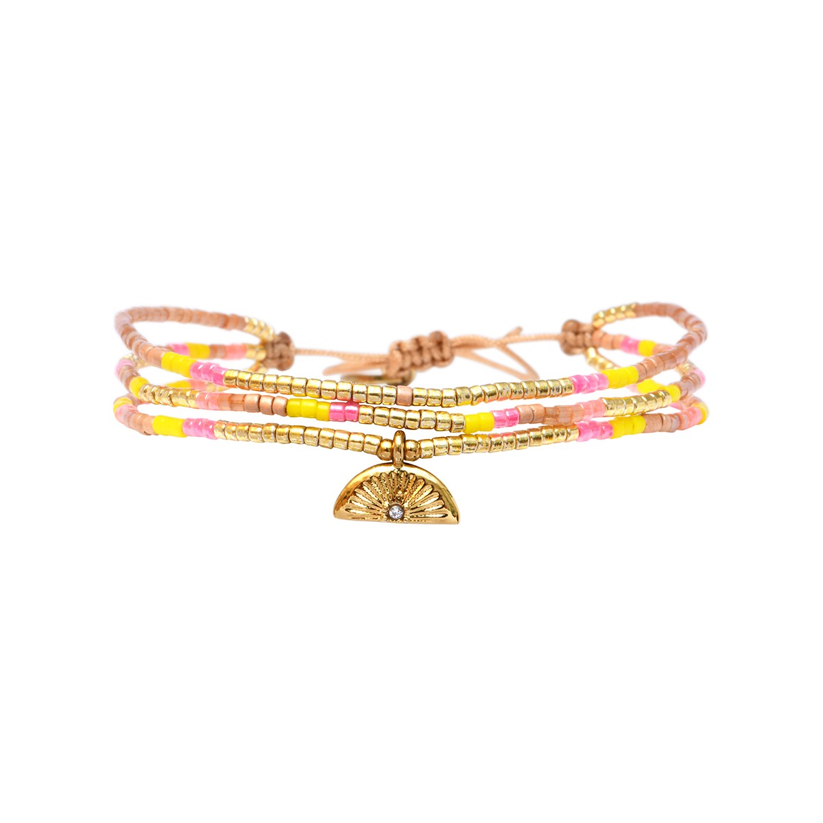 Composition : perles de miyuki dorées - jaune journée ensoleillée - rose terracotta - satin de soie topaze - rose fluo south beach - pêche melba