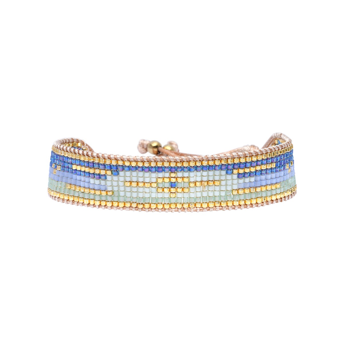 Composition : perles de miyuki dorées - vert flâner au jardin - champagne clair sieste au soleil - vert d'eau - bleu méditation - bleu abysse
