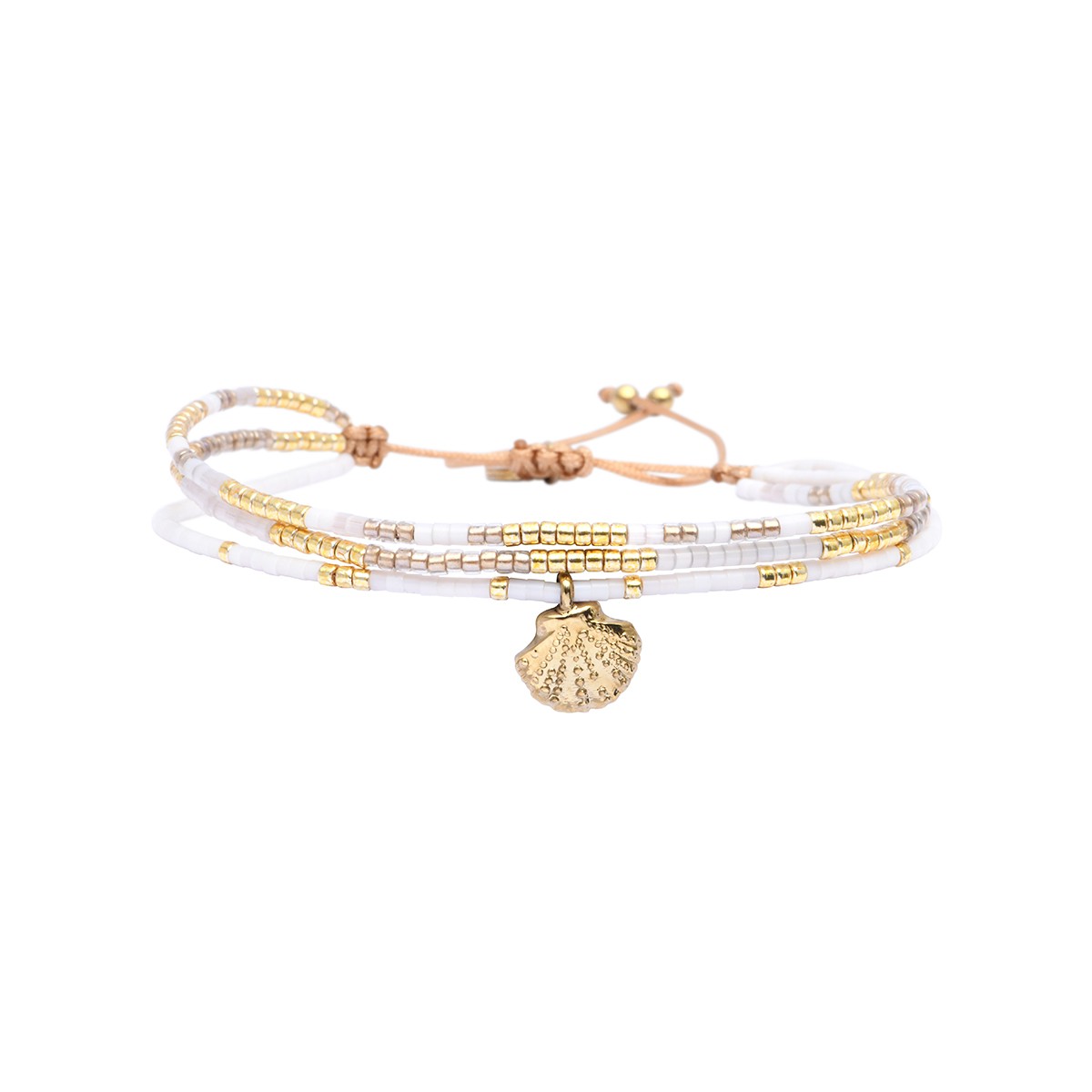 Composition : perles de miyuki dorées - blanc de soie laiteux ou milky white silk - blanc chaud - blanc soie de pêche - cristal lustré doublé d'or