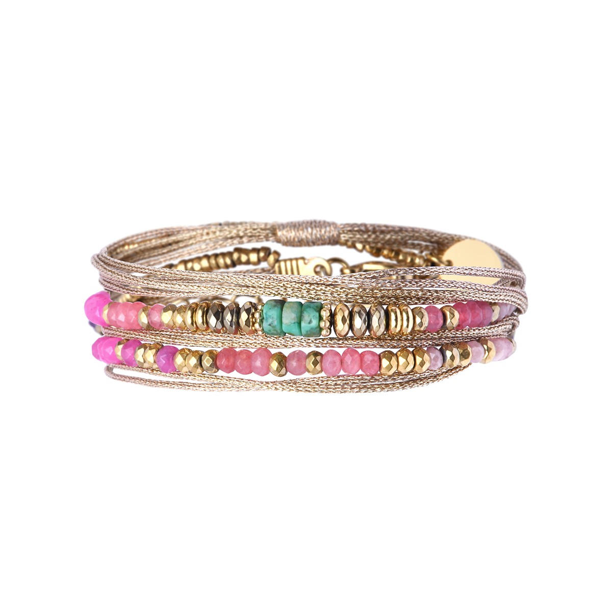 Le bracelet 2 tours Rim nude, entièrement confectionné à la main, à enrouler autour du poignet, est composé de rhodonite, pierre de lune rose, jade fuchsia, turquoise africaine, hématites dorées et fil de soie tréssé.