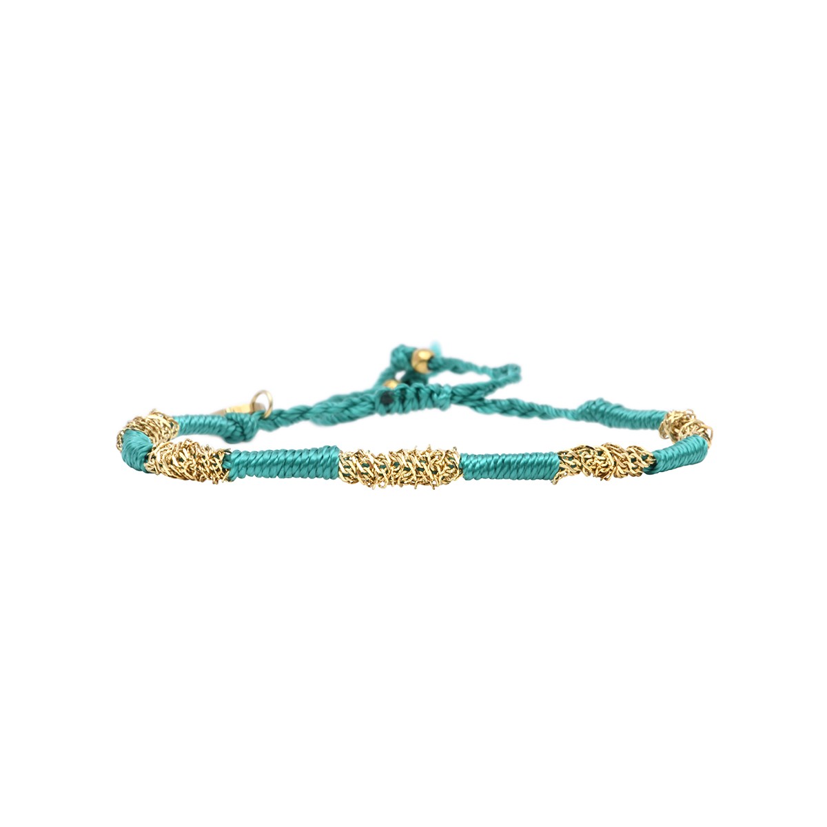 Le bracelet Hanaya, entièrement tréssé à la main, est composé de fil de soie mystique lagon et de torsades de chaînes en acier inoxydable.