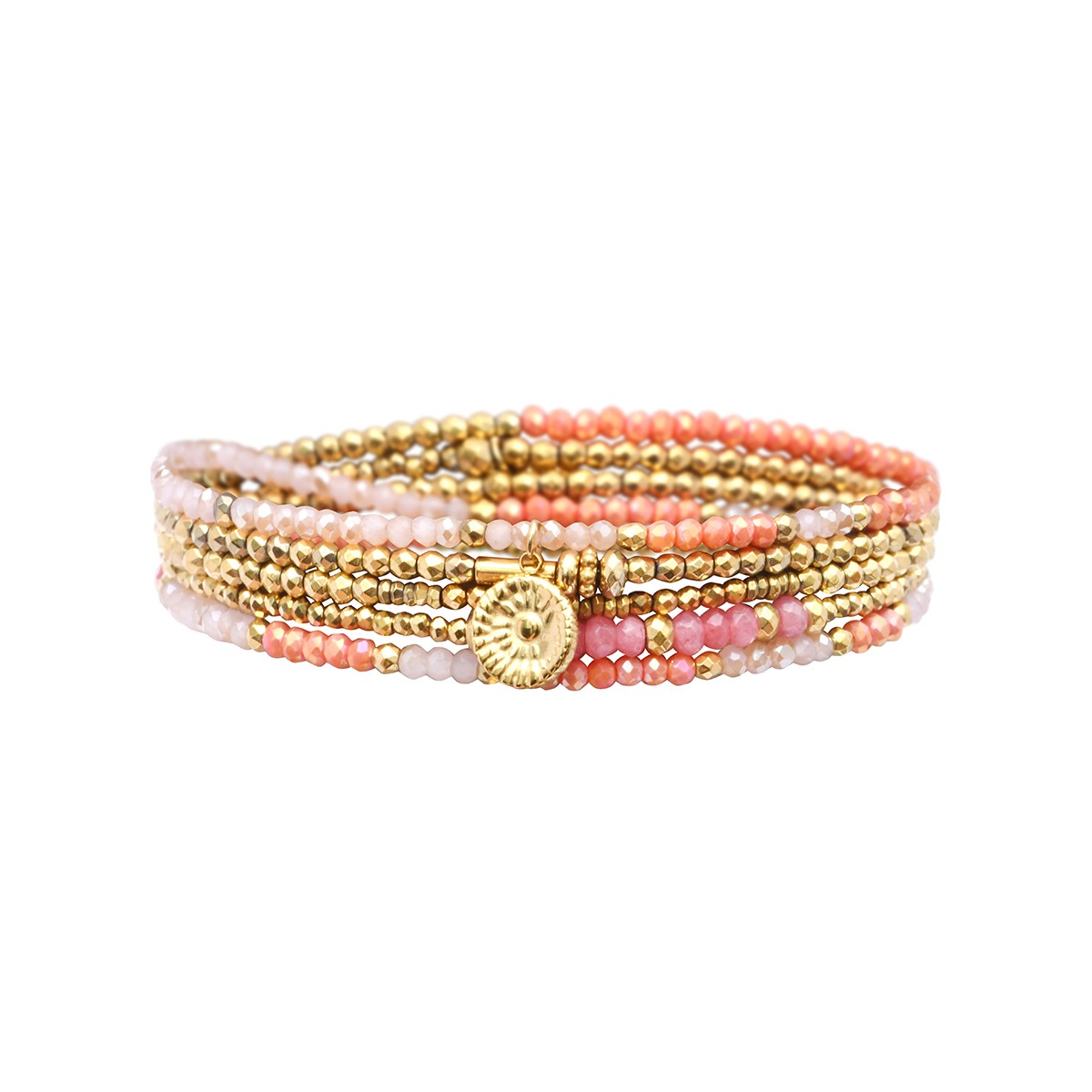 Le bracelet élastique 5 tours Gaby, entièrement confectionné à la main, est un bijou 2 en 1 pouvant se porter également en sautoir. Il est composé de jade rose, cristal rose bora bora, cristal rose incarnat, hématites dorées et charms en acier inoxydable.