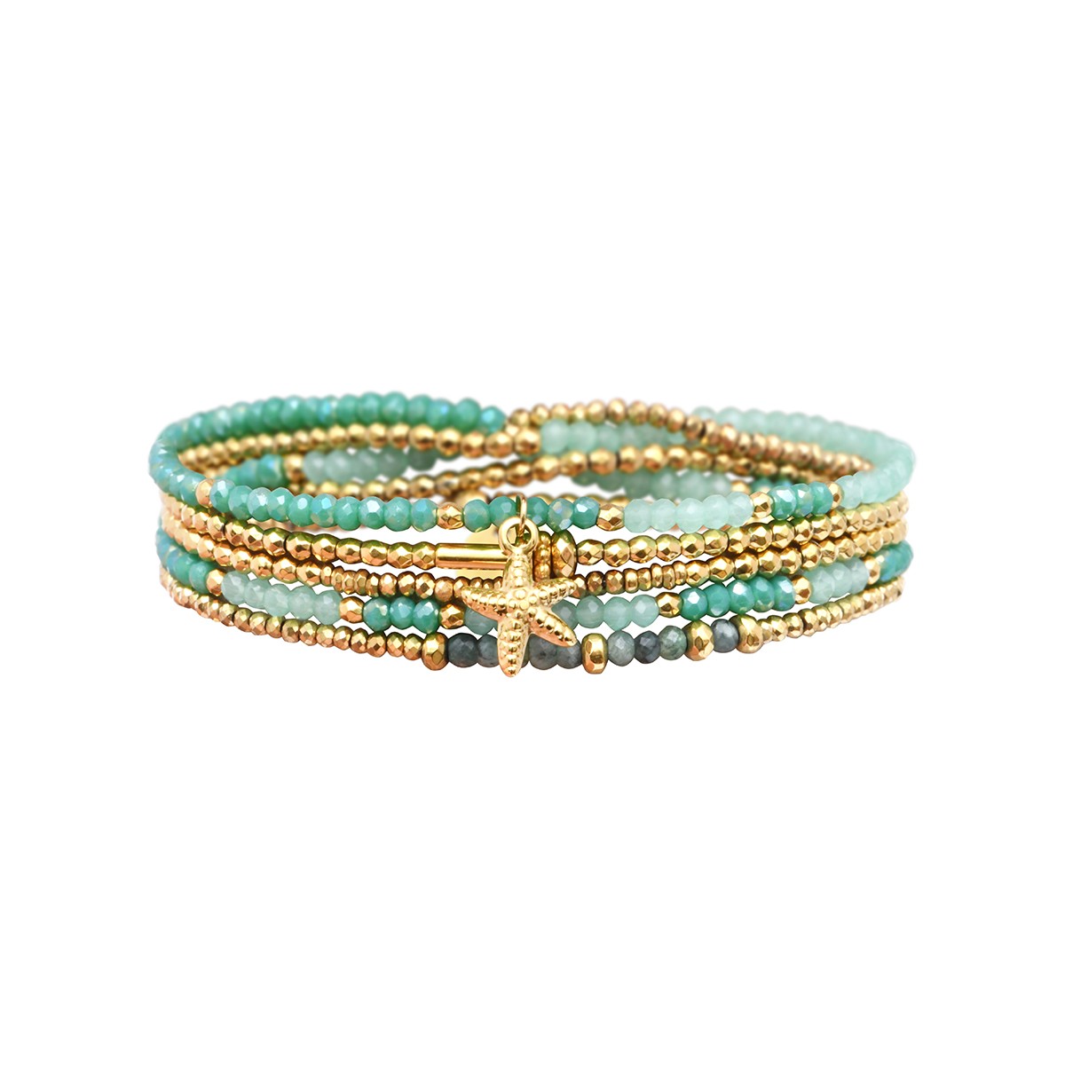 Le bracelet élastique 5 tours Gaby, entièrement confectionné à la main, est un bijou 2 en 1 pouvant se porter également en sautoir. Il est composé de cristal turquoise mer des caraïbes, jade bleu, cyanite, hématites dorées et charms en acier inoxydable.