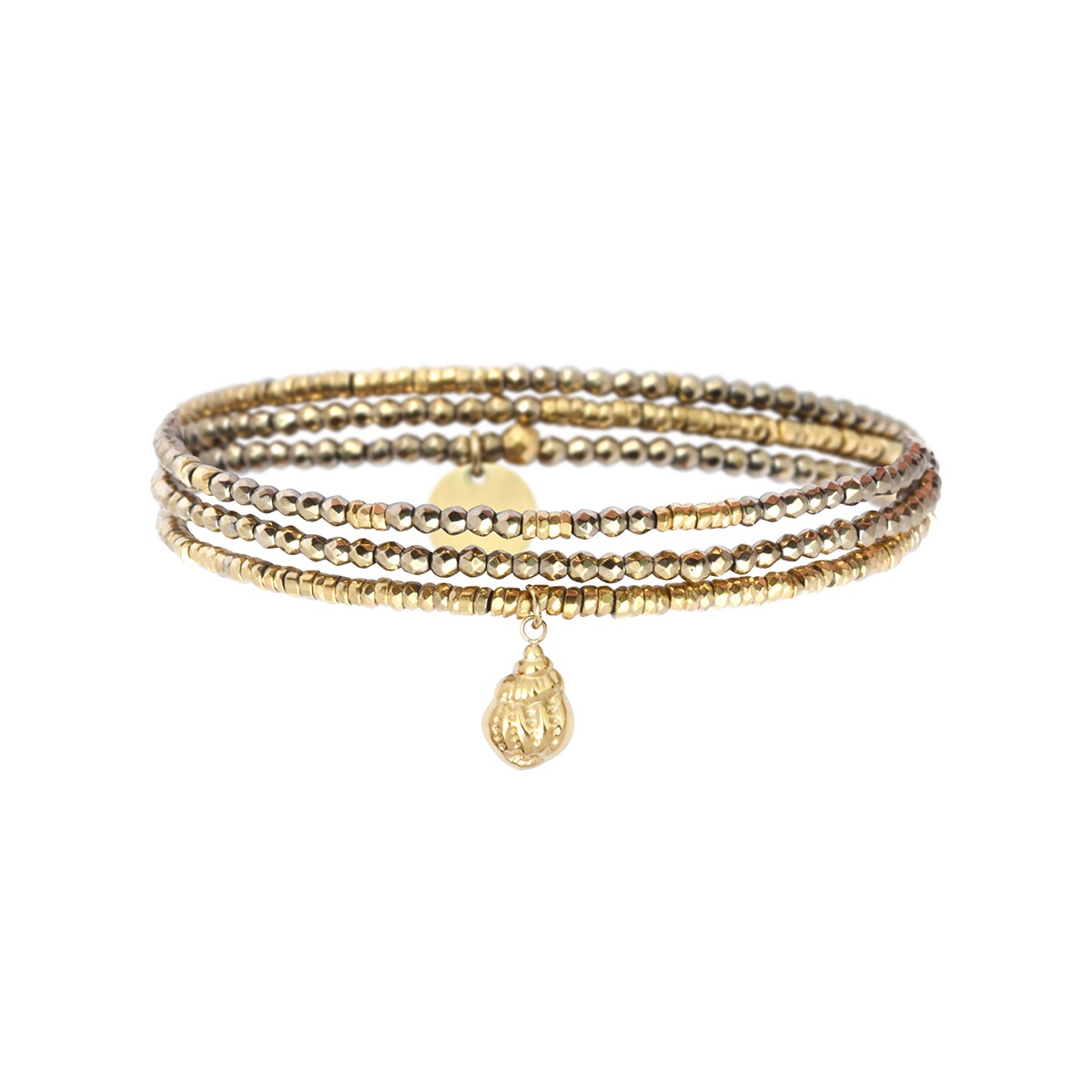 Le bracelet Ness coquillage, entièrement confectionné à la main, est un bijou 2 en 1 pouvant se porter également en collier. Il est composé de fines pépites d'hématites dorées et charms coquillage en acier inoxydable.