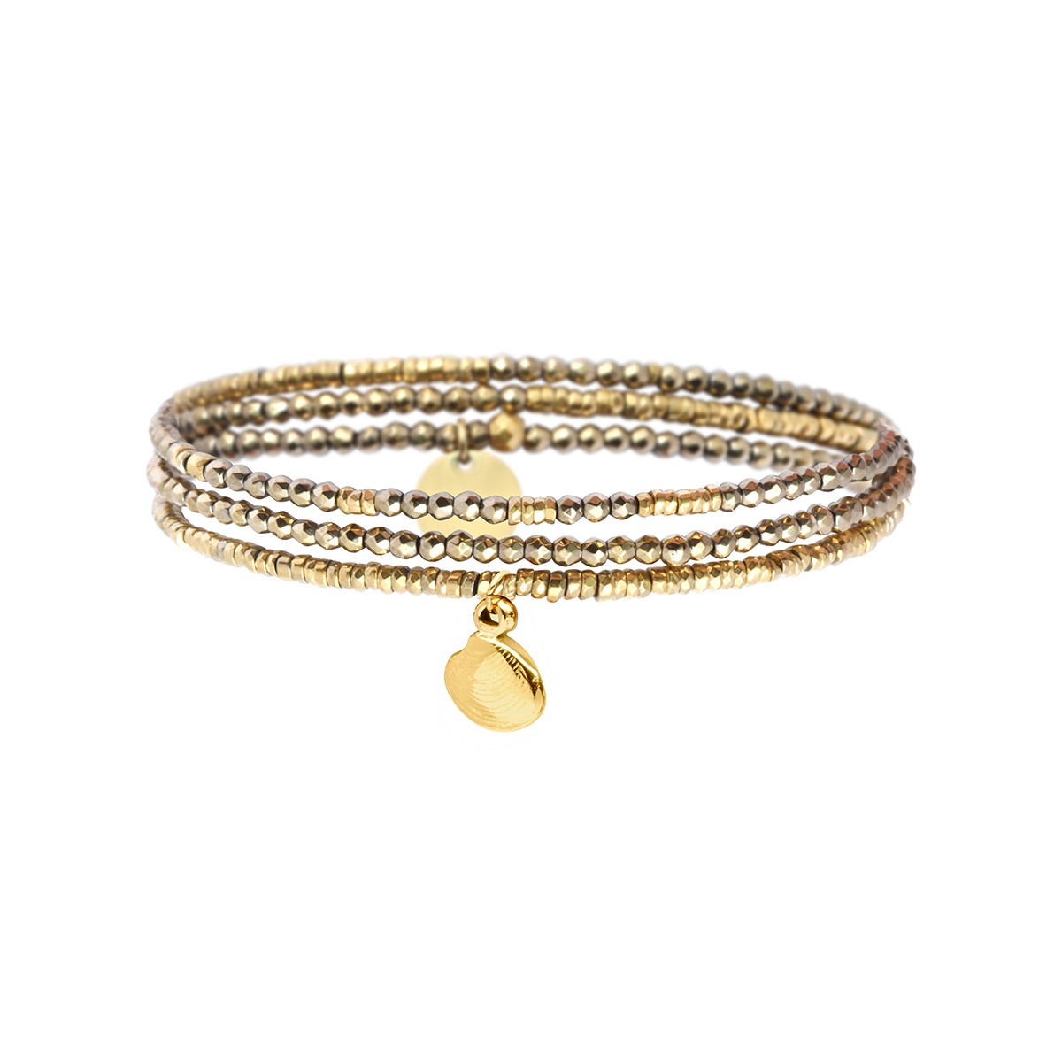 Composition: fines pépites d'hématites dorées et charms coquillage en acier inoxydable.