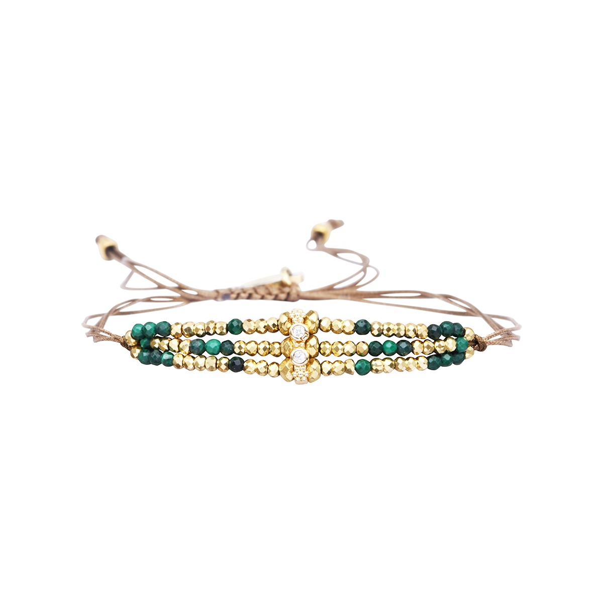 Le bracelet Camelia, 3 rangs, est composé de malachite, fines pépites d'hématites dorées et charms en acier inoxydable ornés de zirconium.