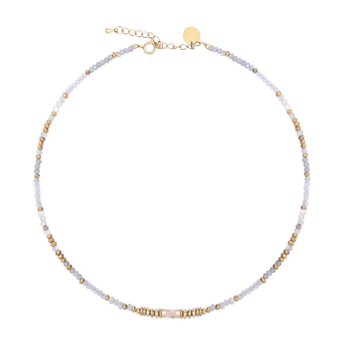 Le Collier Rim, entièrement confectionné à la main, est composé de nacre, pierre de lune blanche, cristal de roche et hématites dorées.