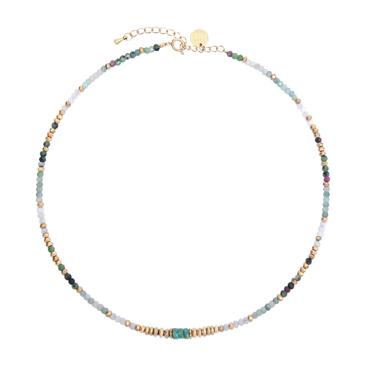 Le Collier Rim, entièrement confectionné à la main, est composé de turquoise africaine, rubis zoïste, pierre de lune blanche et hématites dorées.