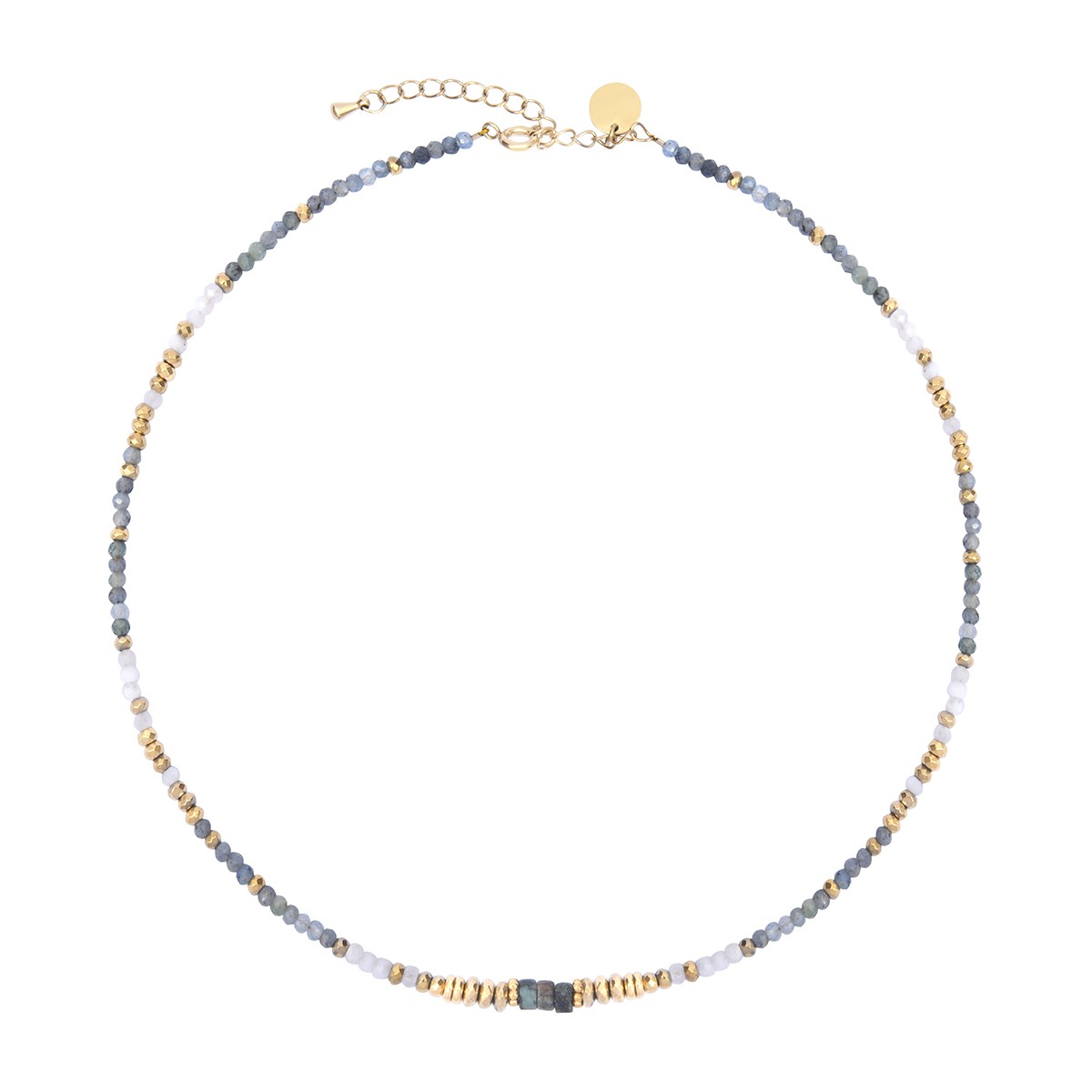 Le Collier Rim, entièrement confectionné à la main, est composé de turquoise africaine, pierre de lune blanche, cyanite et hématites dorées.