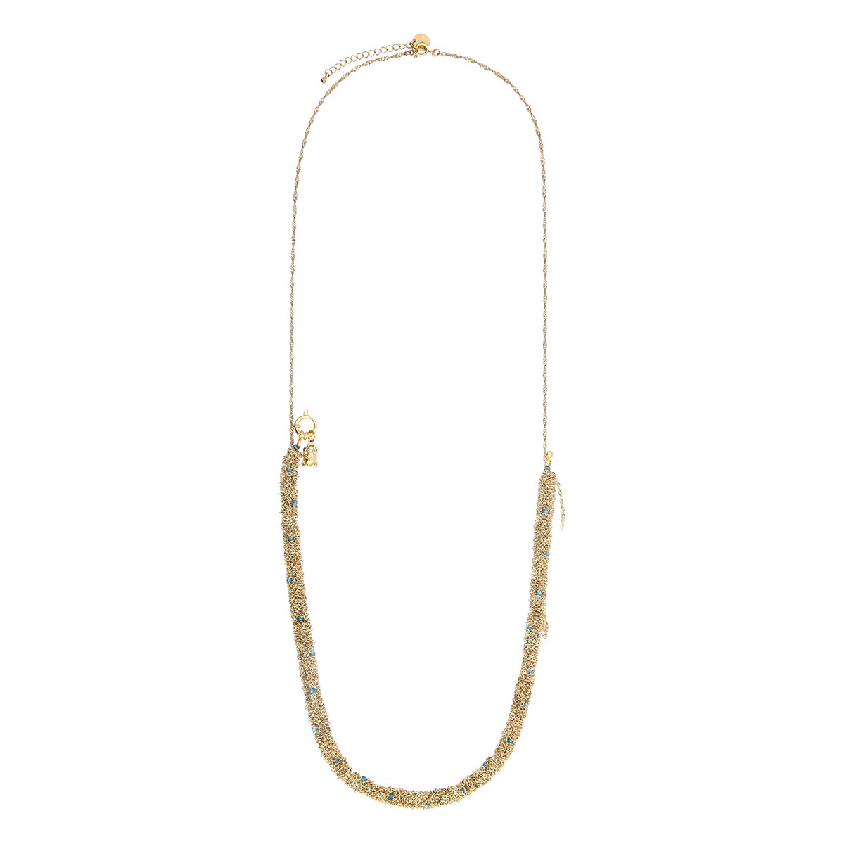 Le Collier Romy 2 en 1, entièrement tréssé à la main, est composé d'apatite et chaînes en acier inoxydable, peut se porter également en sautoir.