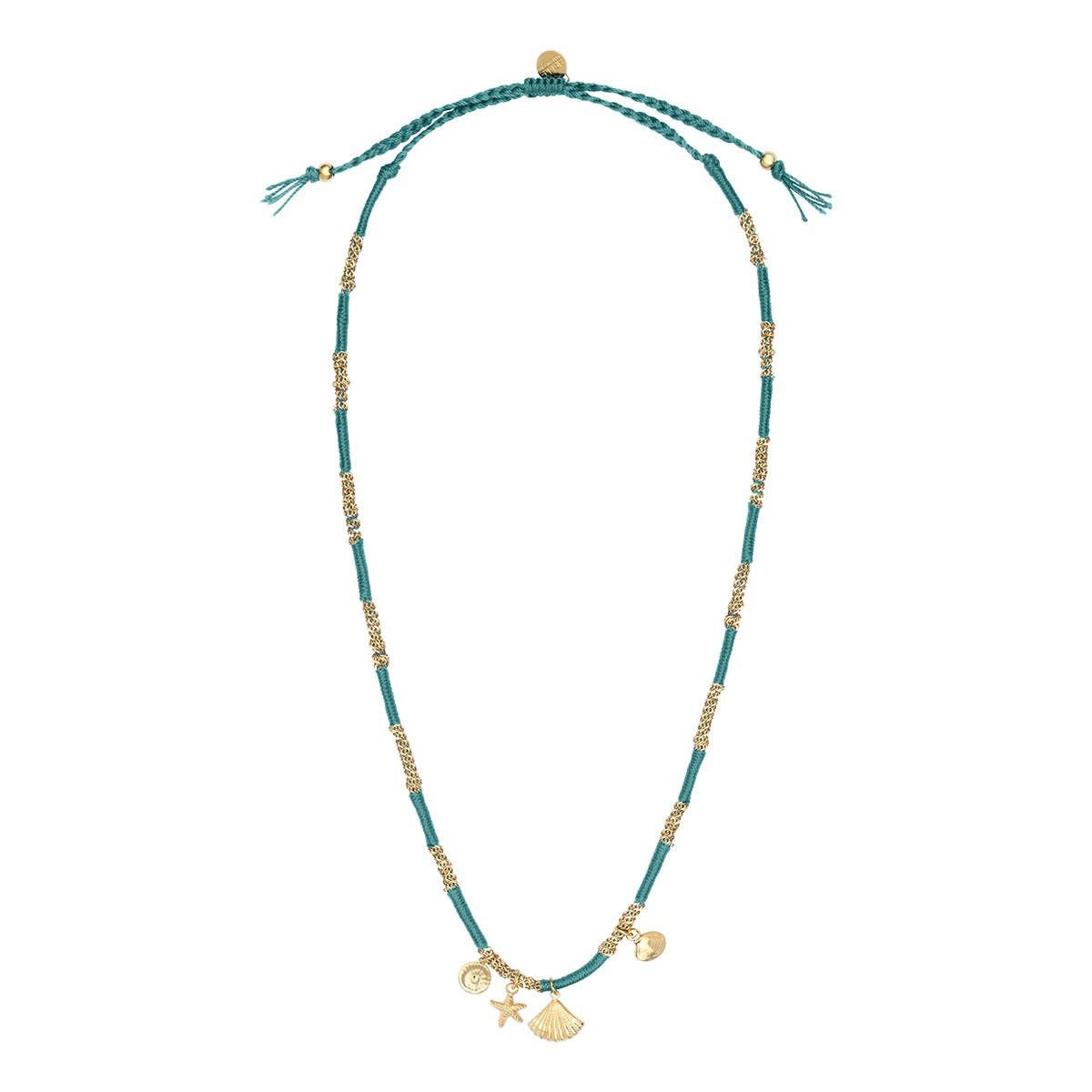 Le Collier Hanaya, entièrement tréssé à la main, est composé de fil de soie mystique lagon et de torsades de chaînes en acier inoxydable.