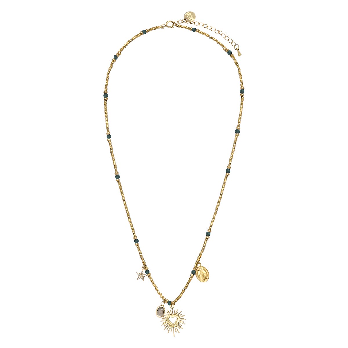 Le Collier Lucky charms, entièrement confectionné à la main, est composé de turquoise africaine, fines pépites d'hématites dorées et charms en acier inoxydable.