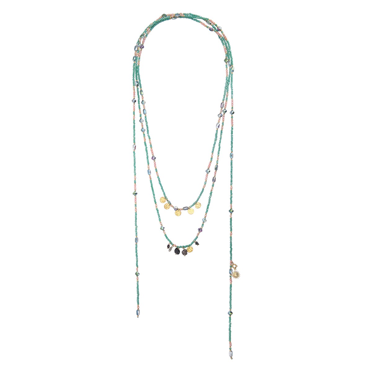 La Ceinture bijou Prana, entièrement confectionné à la main, à nouer est un bijou 2 en 1 pouvant se porter également en collier multi-rangs ou sautoir. Il est composé de cristal turquoise et charms en acier inoxydable.