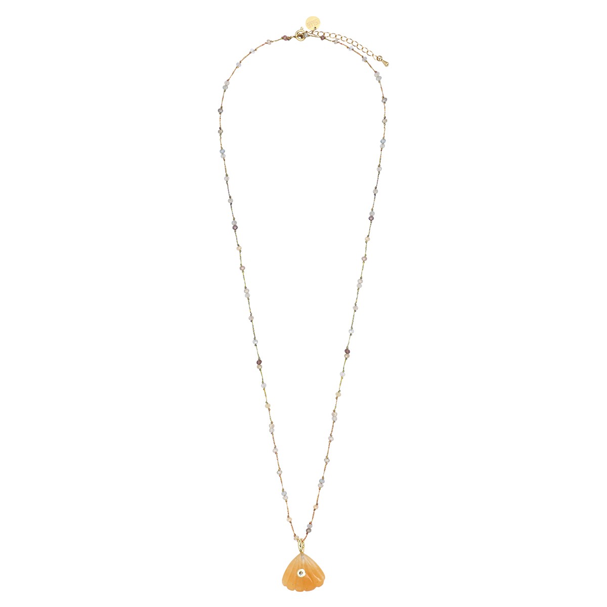 La Sautoir Alba, entièrement confectionné à la main, est composé d'un pendentif coquillage en topaze et d'oxydes de zirconium entrelacées de nœuds sur fil de soie.