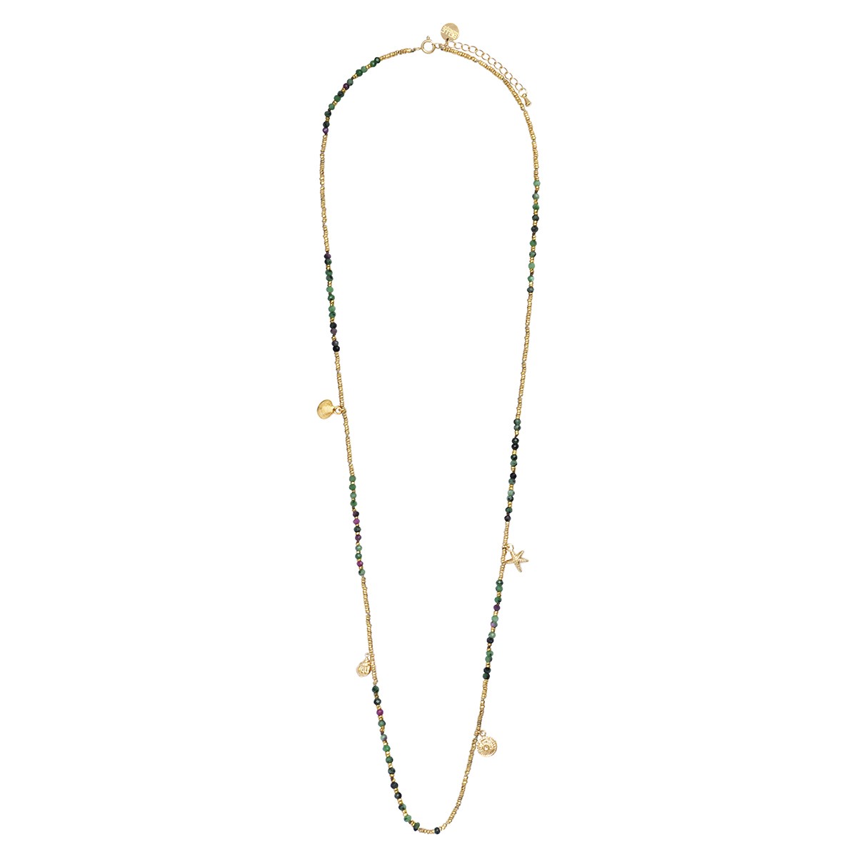 Le Sautoir Lola, entièrement confectionné à la main, est composé de rubis zoïste, fines pépites d'hématites dorées et charms en acier doré inoxydable.