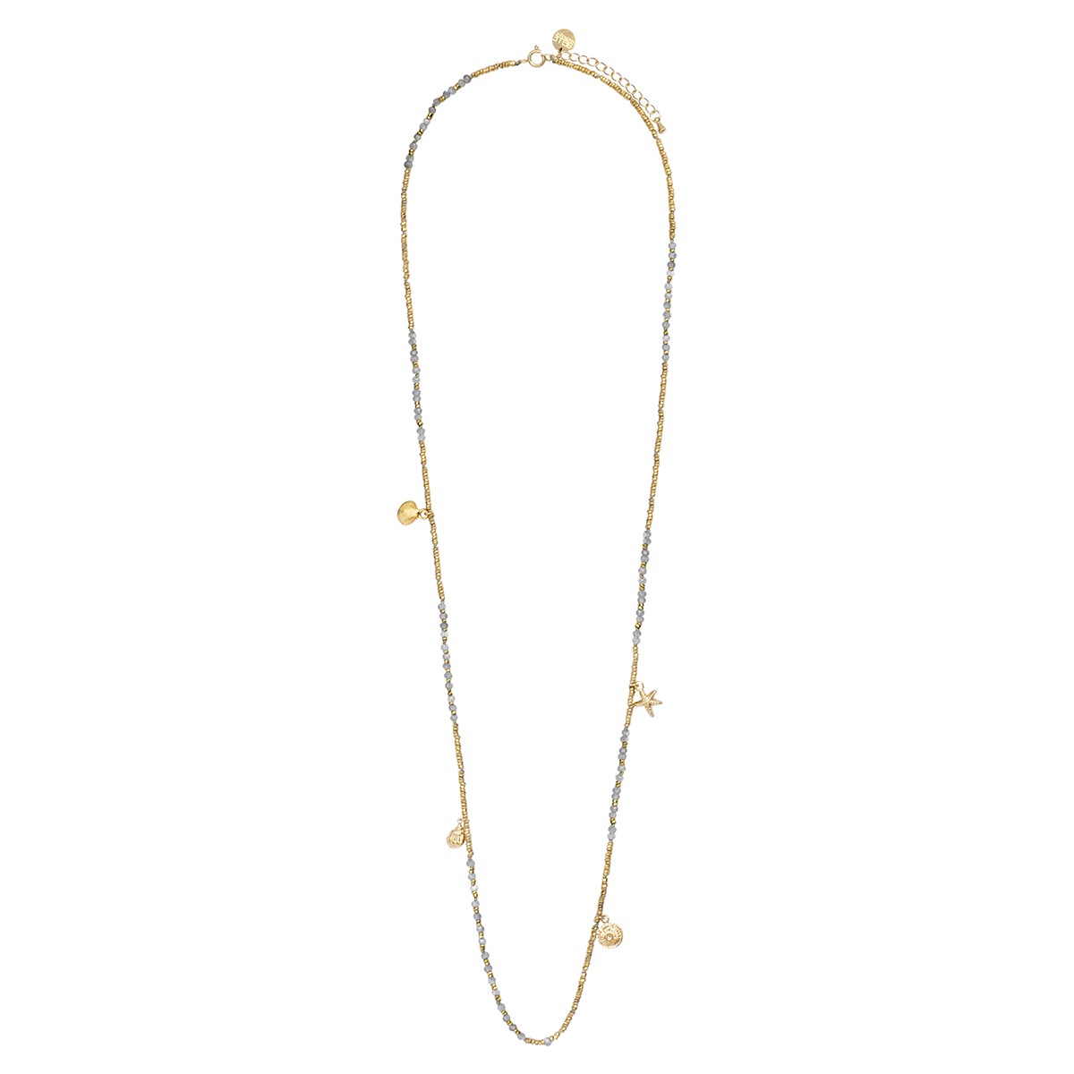 Le Sautoir Lola, entièrement confectionné à la main, est composé de labradorite, fines pépites d'hématites dorées et charms en acier doré inoxydable.