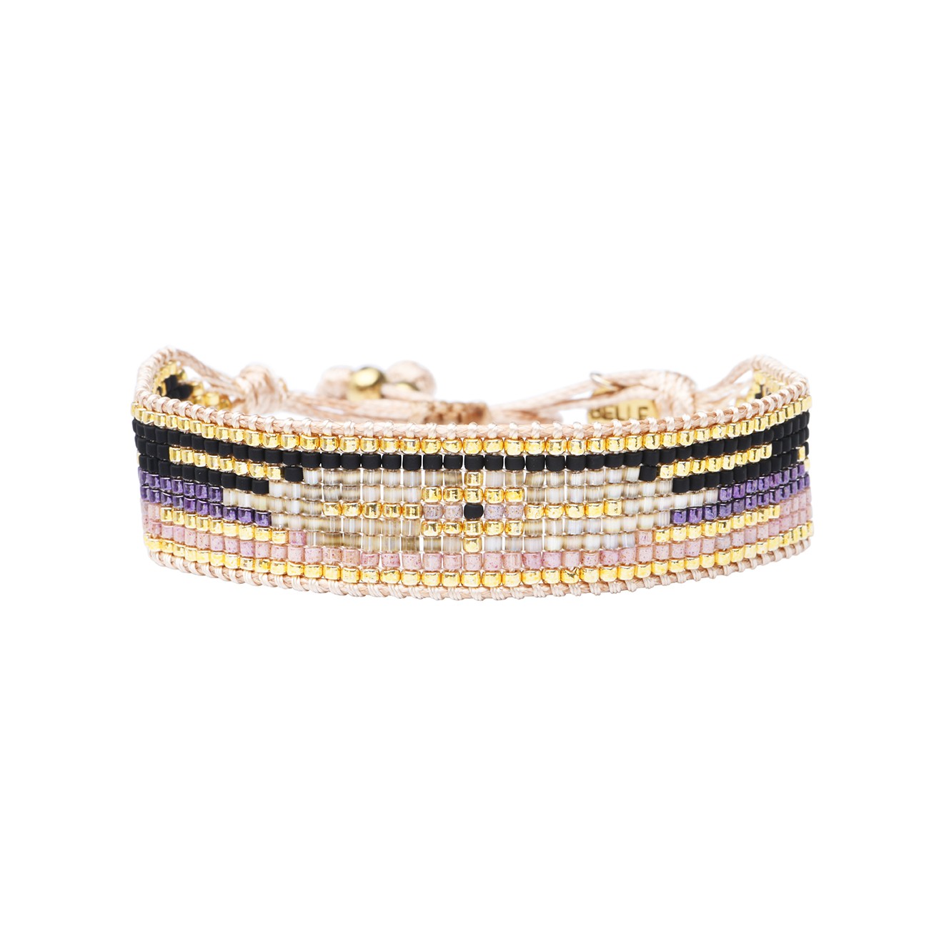 Composition : Perles de miyuki dorées - Noir d'ivoire mat - Violet Éclatant - Ombre à paupières rose - Champagne