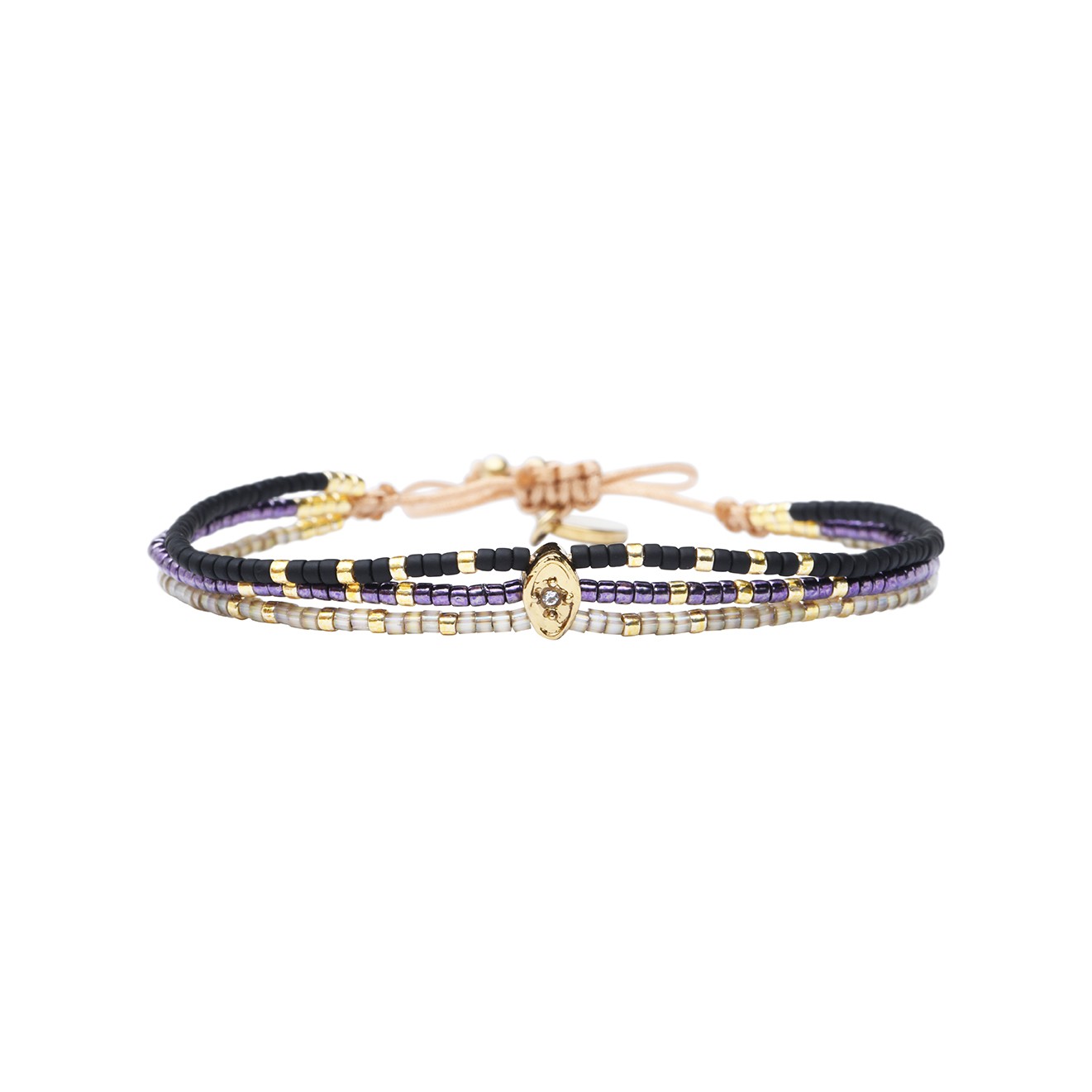 Composition : Perles de miyuki dorées - Noir d'ivoire mat - Violet Éclatant - Ombre à paupières rose - Champagne
