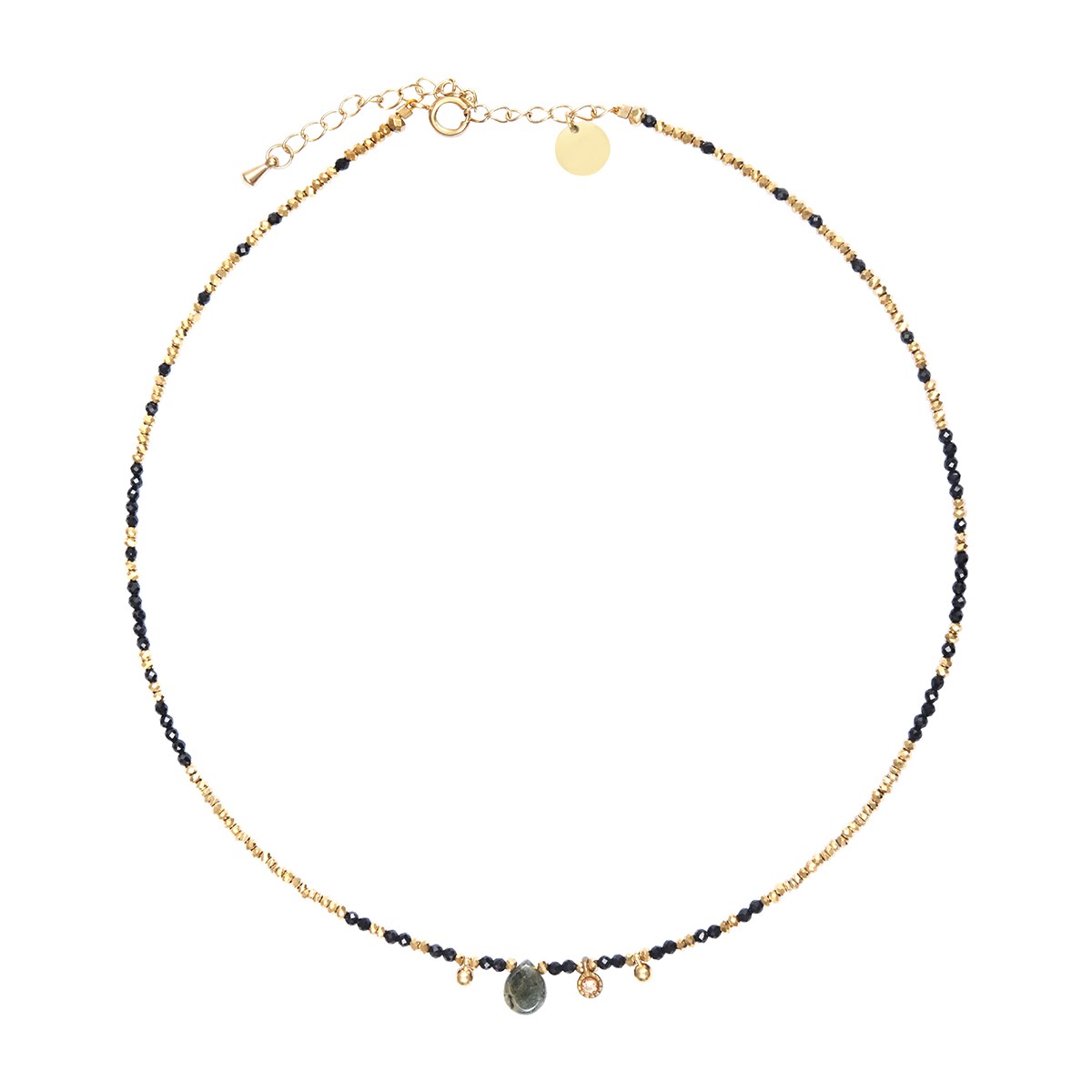 Le collier ras de cou Gabrielle est composé de tourmaline, Spinelle noir, fines pépites d'hématites dorées et charms en acier inoxydable. Fermoir anneau et chaîne de réglage en acier inoxydable.