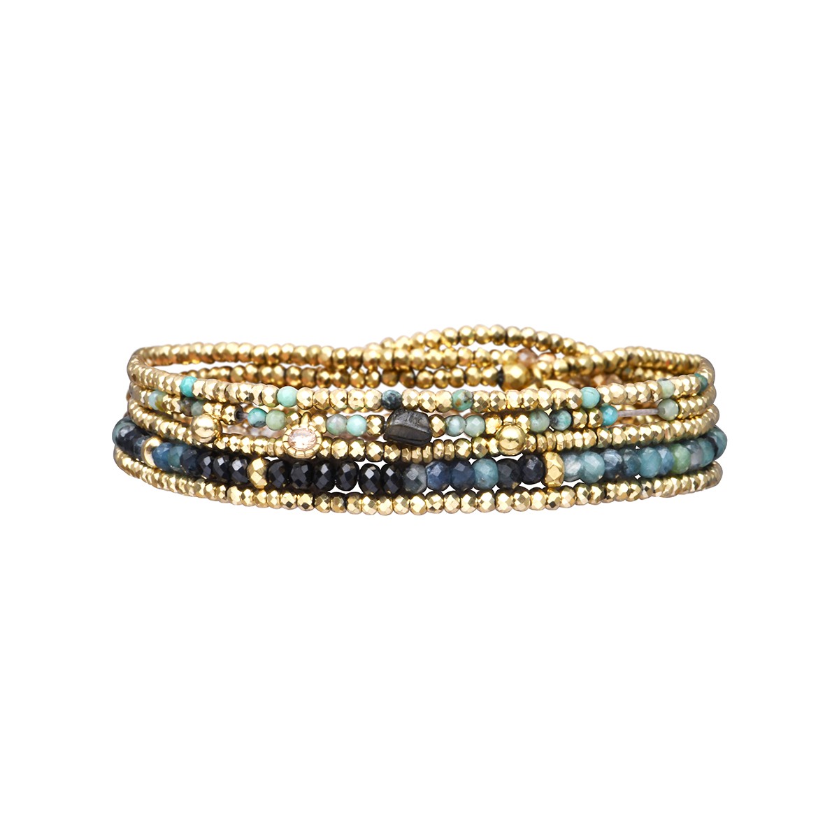 Le bracelet élastique Gabrielle 5 tours ou Sautoir est composé de tourmaline bleue, turquoise Africaine, tourmaline, fines pépites d'hématites dorées et charms en acier inoxydable. C'est un bijou deux en un qui se peut porter en bracelet 5 tours ou en sautoir ! Longueur bracelet : 15 à 18 cm / Longueur sautoir : 81 cm.