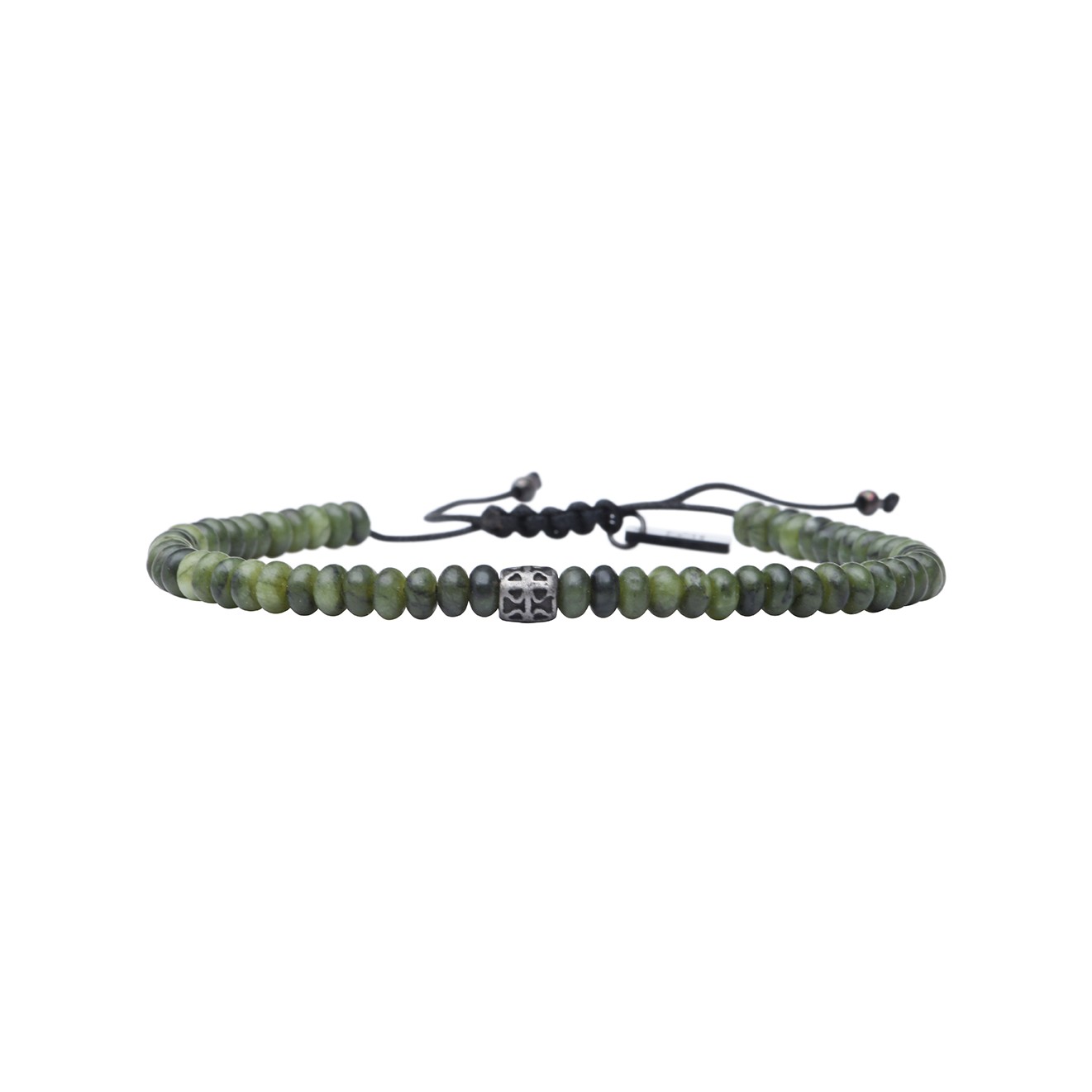 Le bracelet Gary, monté sur cordon, est composé de Jade vert et perle tribale en acier inoxydable. Fermoir à nœud coulissant ajustable. Longueur ajustable : 17 à 28 cm