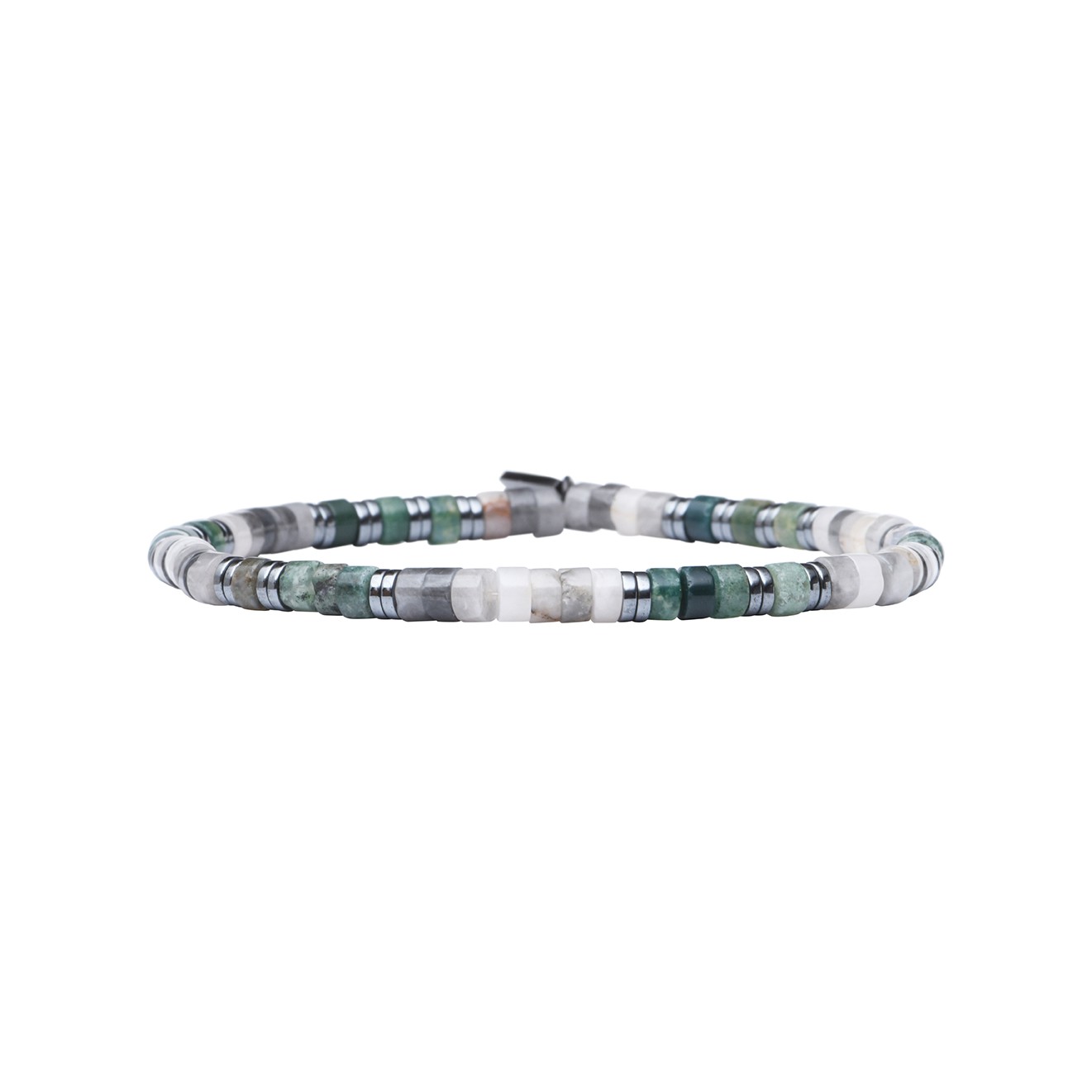 Le bracelet Leo, monté sur élastique, est composé de Turquoise Africaine, Obsidienne et Hématite. Longueur : 16 à 20 cm