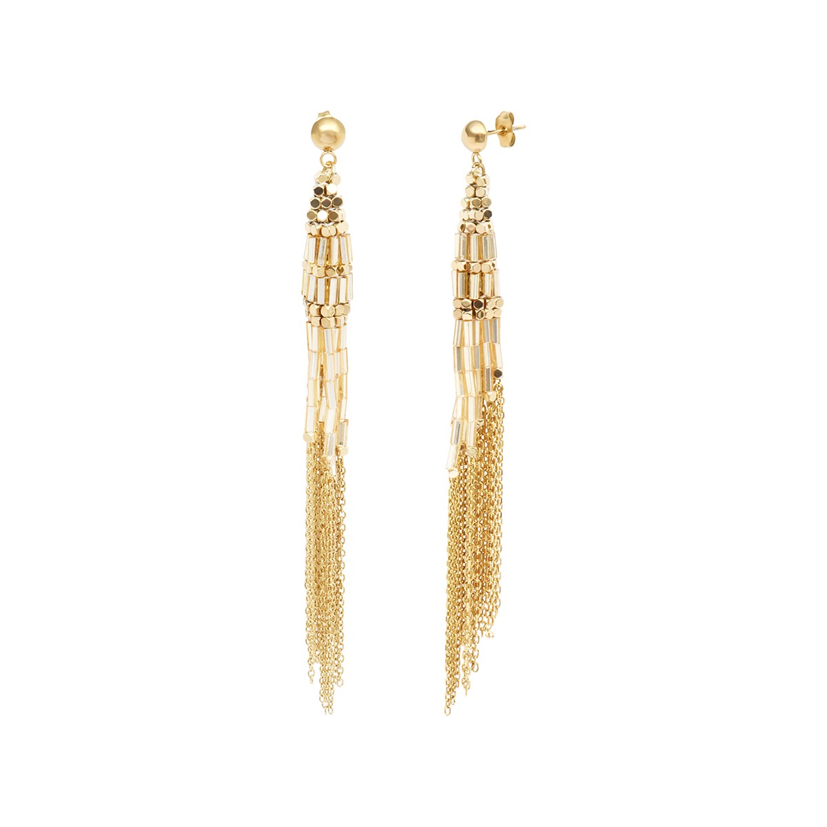 Les boucles d'oreilles Marylin sont entièrement tissées main et sont composées de perles de cristal de couleur or, hématites dorées et cascade de chaînes en acier inoxydable.
