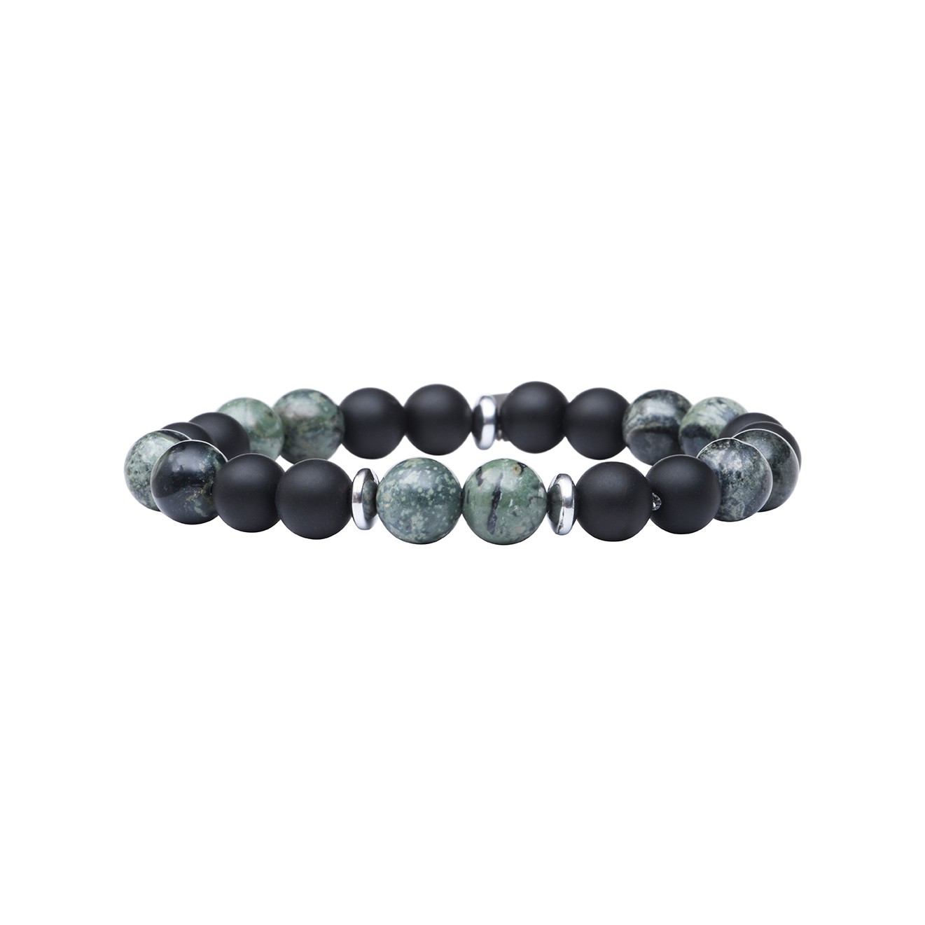Le bracelet Mika onyx, monté sur élastique, est composé de Séraphinite, onyx mat, perles plates en acier inoxydable.