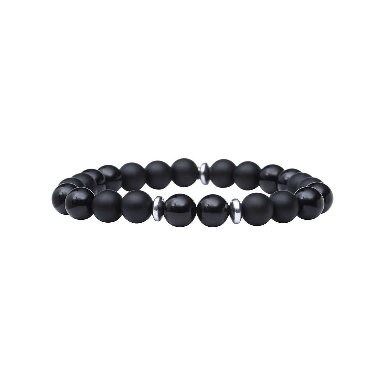 Le bracelet Mika onyx, monté sur élastique, est composé de pierres semi-précieuses, onyx mat et poli, perles plates en acier inoxydable.