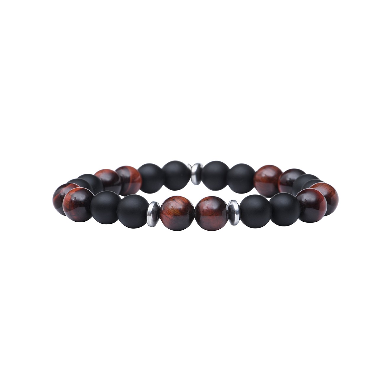 Le bracelet Mika onyx, monté sur élastique, est composé d'Œil de Tigre rouge, onyx mat, perles plates en acier inoxydable.