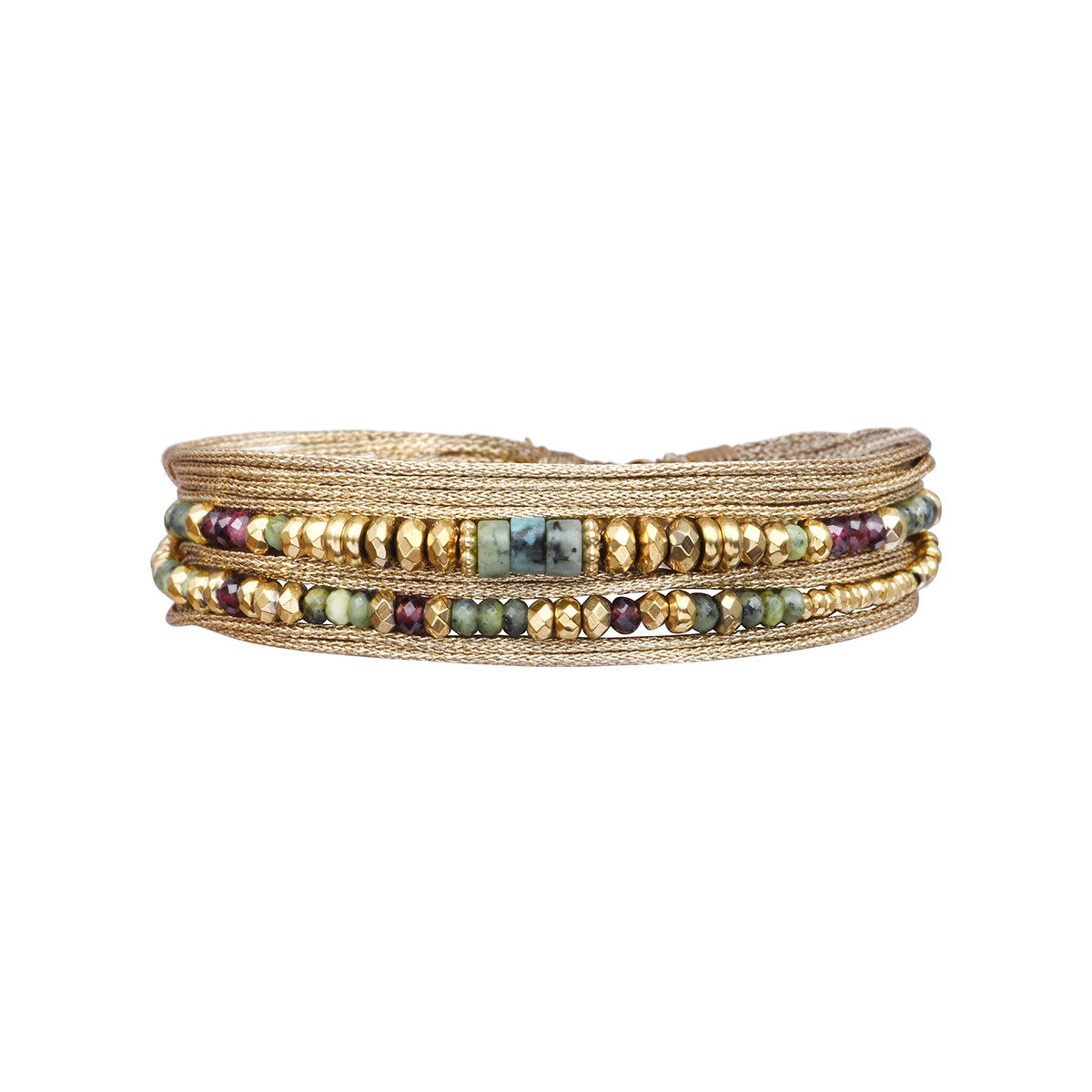 Le bracelet Rim 2 tours, entièrement confectionné à la main, à enrouler autour du poignet, en fil de soie tréssé, est composé de tourmaline verte, grenat naturel et hématites dorées. Perles fleur, fermoir à anneau et chaînette d’extension en acier inoxydable.