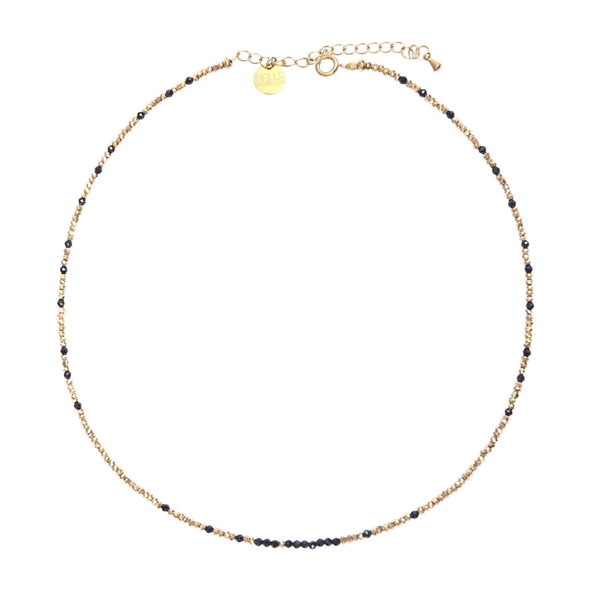 Le collier Sarah est composé de Spinelle noire et fines pépites d'hématites dorées