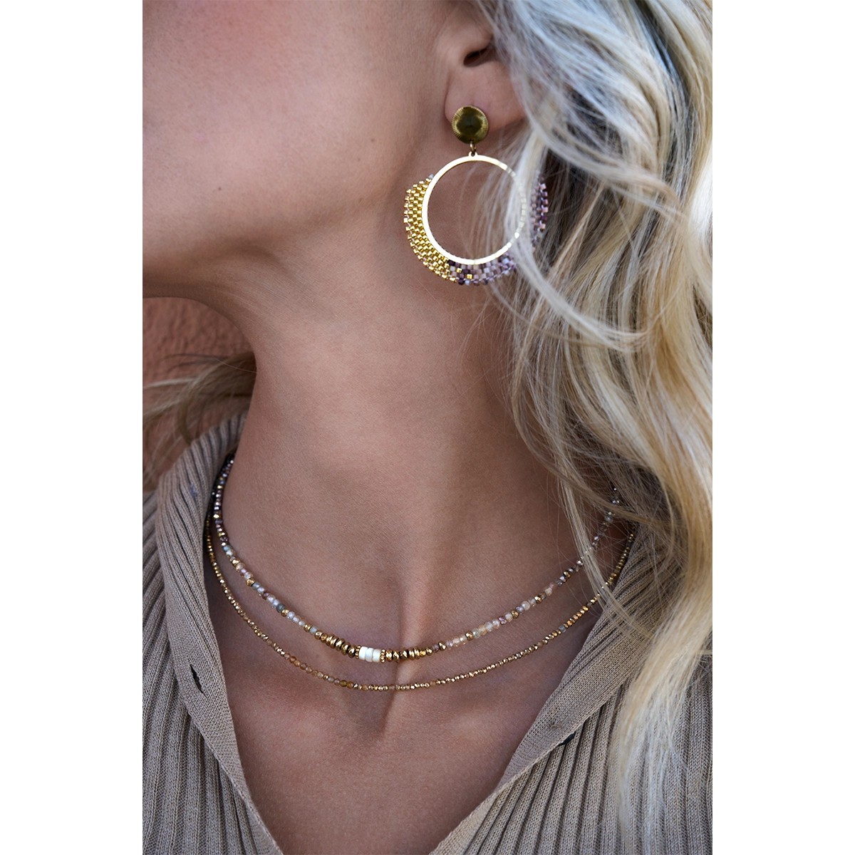 Le collier Sarah est composé de Tourmaline jaune, Cristal et fines pépites d'hématites dorées