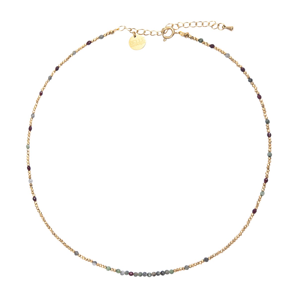 Le collier Sarah est composé de Tourmaline Verte, Grenat naturel et fines pépites d'hématites dorées