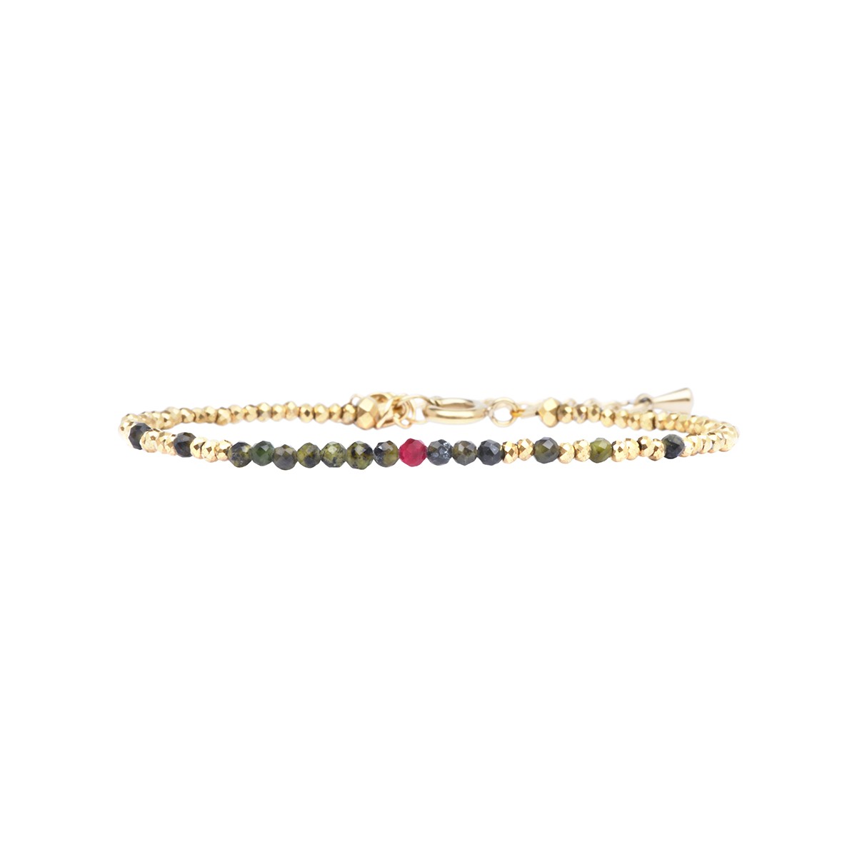Le bracelet Sarah est composé de tourmaline verte, grenat naturel et de fines pépites d'hématites dorées.